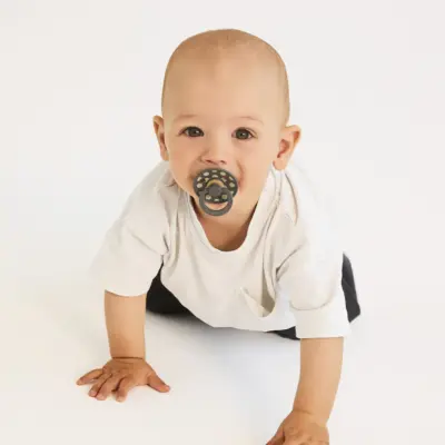 Кръглият лек щит е с леко извита форма, за да осигури минимален контакт с нежната и чуствителна кожа около устата на бебето. Което означава по-малък шанс от натрупване на влага от слюнката, което може да причини обриви и възпалени петна.