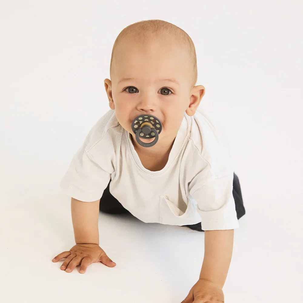 Натуралният каучук е материал, направен от млечната течност на дървото Hevea, рафинирана в жълтия каучук, който познавате от нашите биберони. Каучукът е супер мек, еластичен и устойчив материал, наподобяващ мекото зърно на майката. Въздействат му естествени влияния като UV светлина, въздух, слюнка и топлина. Еластичността на материала позволява на зърното да променя формата и размера си, благодарение на силния вакуум, който бебето създава.