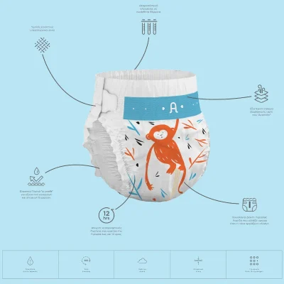 • Перфектна защита от протичане – благодарение на еластичните странични маншети бебешките пелени за еднократна употреба се адаптират към тялото на бебето – маншетите не съдържат латекс.