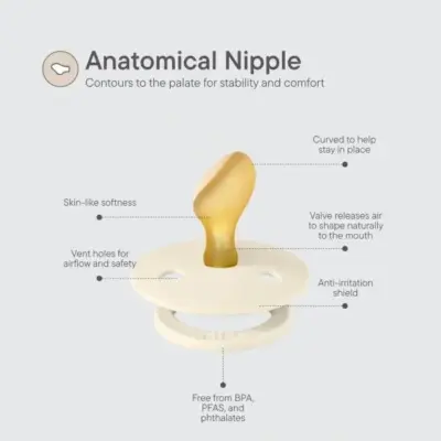 АНАТОМИЧЕН: Анатомичното зърно е извито в горната си част, за да пасне по най-естествен начин на бебешкото небце, а върхът му е скосен за по-добро прилягане върху езика. Благодарение на извитата горна част, положението на езика и техниката на засукване са подобни на естествените по време на кърмене, при което страните на езика се издигат и обхващат зърното. Скосеният връх означава, че не е необходимо бебето да засмуква твърде силно, както се налага при кръглото зърно, за да се сплеска в устата.