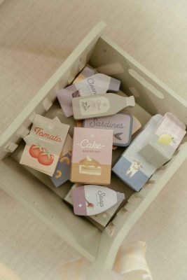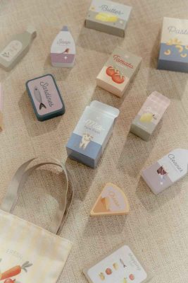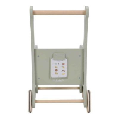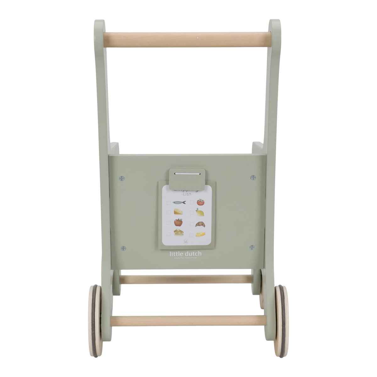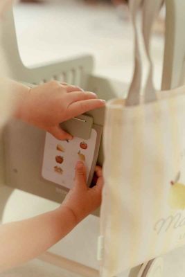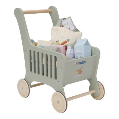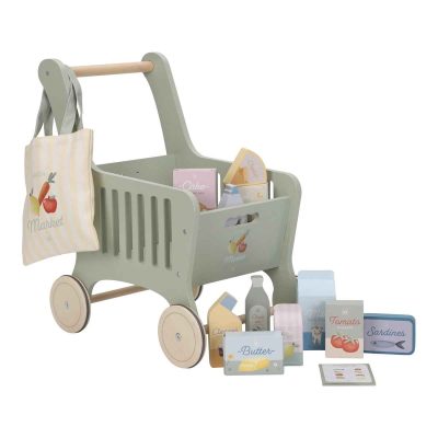 Количката разполага с дървена щипка, която държи „списъка за пазар“ на място – така нищо няма да бъде забравено! Комплектът включва различни продукти за игра и пазарска чанта, така че играта може да започне веднага.