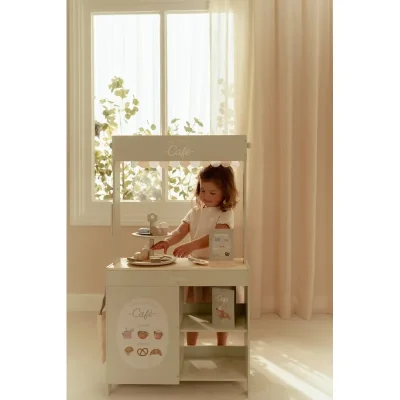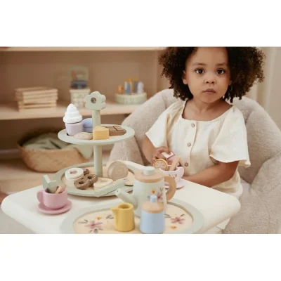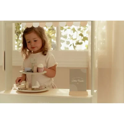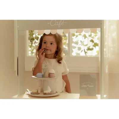 С тази красива дървена многоетажна стойка, пълна с вкусни сладкиши, децата могат да сервират най-красивия следобеден чай. На трите нива ще намерите мъфин, бисквитки и цветни макарони – всички еднакво изкушаващи. Използвайте включения сервиз за торта и менюто с илюстрации, за да оставите гостите да избират. Идеално за въображаема игра и уютни моменти с чай!