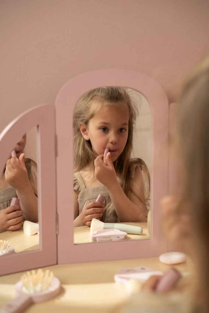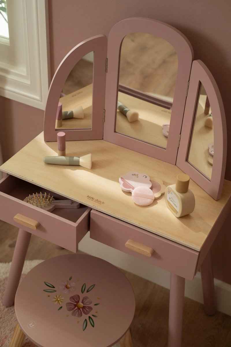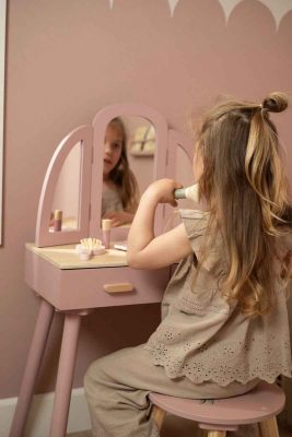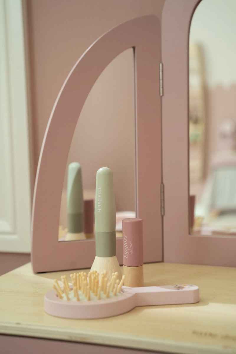 Комплектът включва 6 дървени козметични аксесоара и очарователна табуретка с илюстрация на цвете. Перфектна за ролеви игри и имитация на големите – часове забавление и въображение са гарантирани! Чудесен подарък за всяко малко момиче, което мечтае да бъде принцеса!