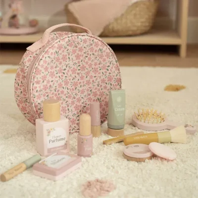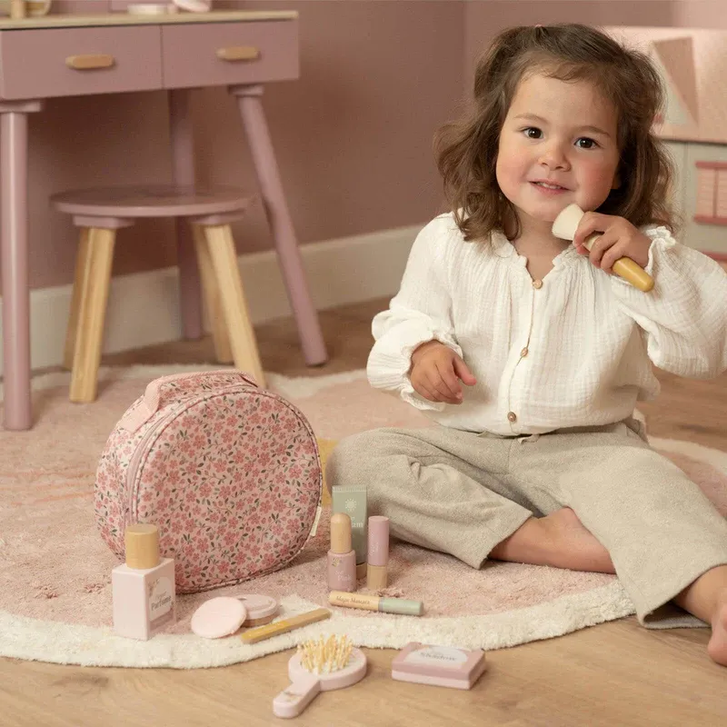 Чантичката е с нежен флорален десен и съдържа 10 различни дървени продукта за красота. Има ръчно огледало, флакон,парфюм и крем. Комплектът се състои още от червило, лак за нокти, пудра за лице, руж, сенки за очи, спирала и пила за нокти. Този калъф за красота от Little Dutch гарантира цялото забавление, но не и бъркотията от истинския грим:)