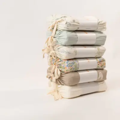 Комплектът пристига в практична торбичка от същата материя – идеална за вещи, играчки, пелени или козметика