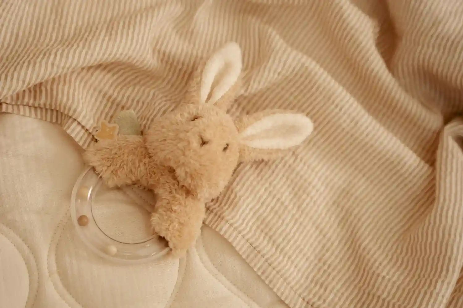 Играйте си с ушите или разтривайте меката козина. Прозрачният пръстен е пълен с малки мъниста, които дрънкат, когато бебето си играе с него. Тази атрактивна бебешка играчка подобрява координацията ръка-око и стимулира сетивата.