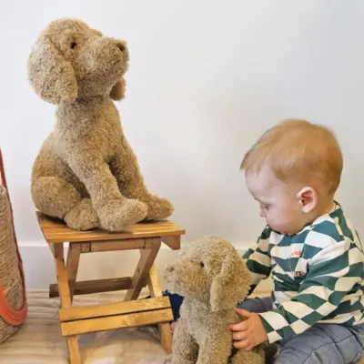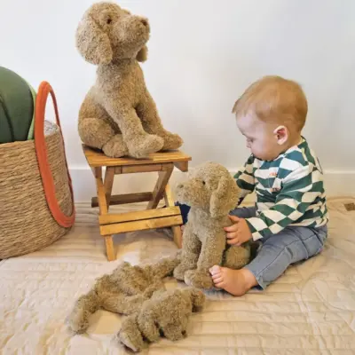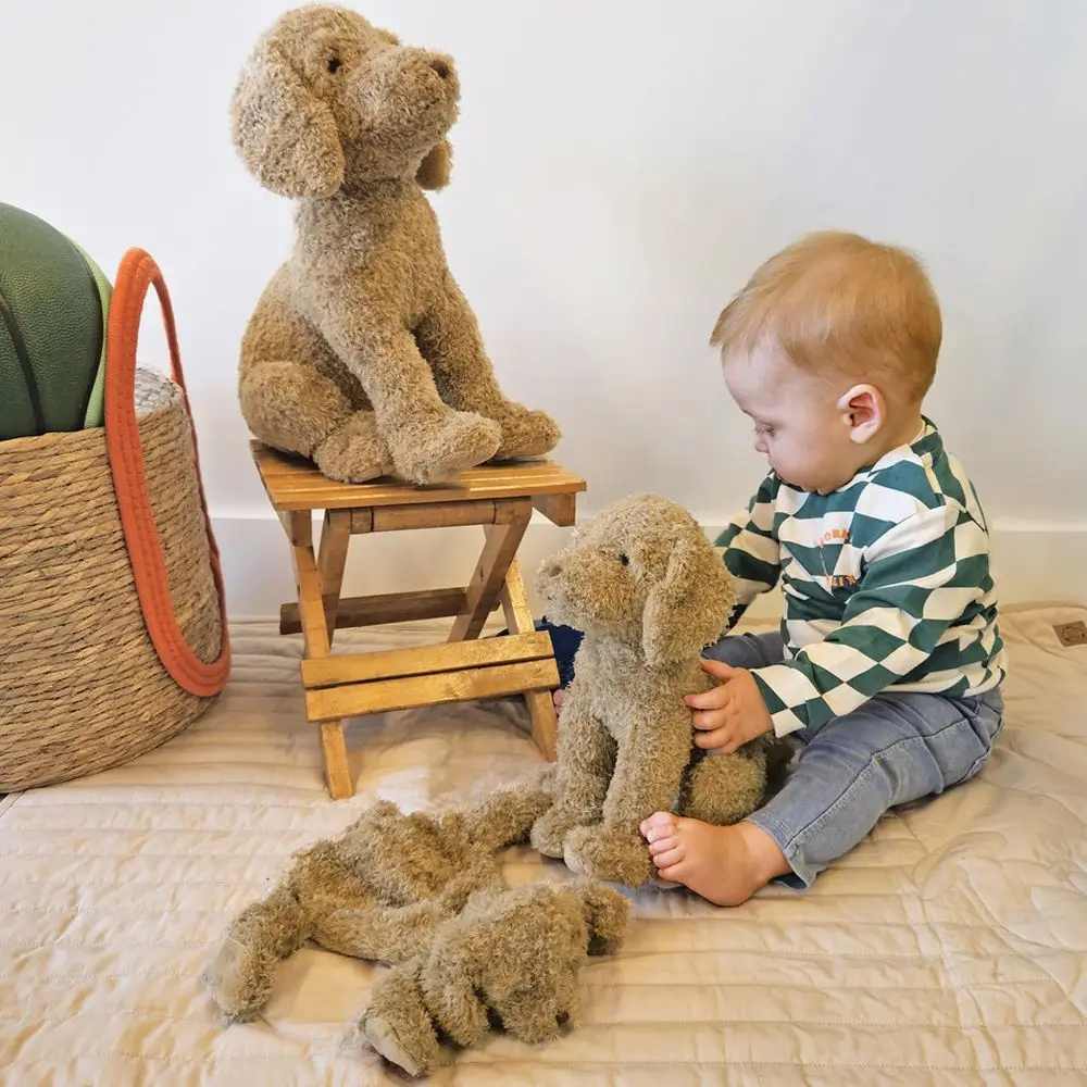 Плюшено, изключително меко кученце, удобно за хващане и гушкане. Чудесен първи приятел за всяко дете и весело допълнение за детската стая. Изработена от безопасни материали, отговарящи на всички европейски стандарти за качество. Може да се пере в пералня на 30 градуса.