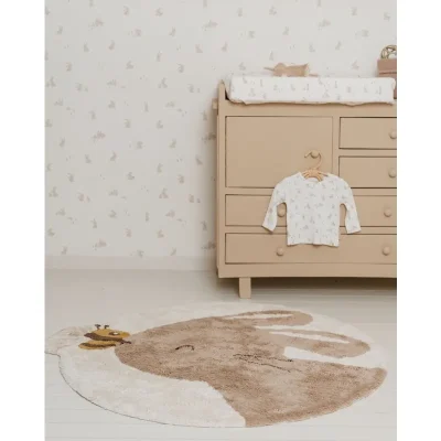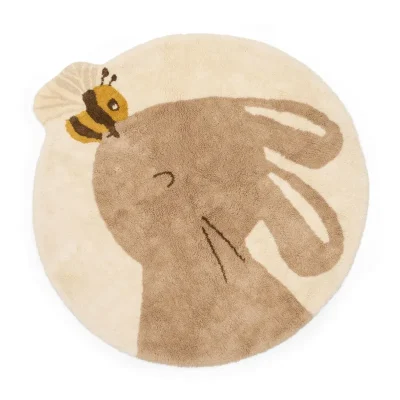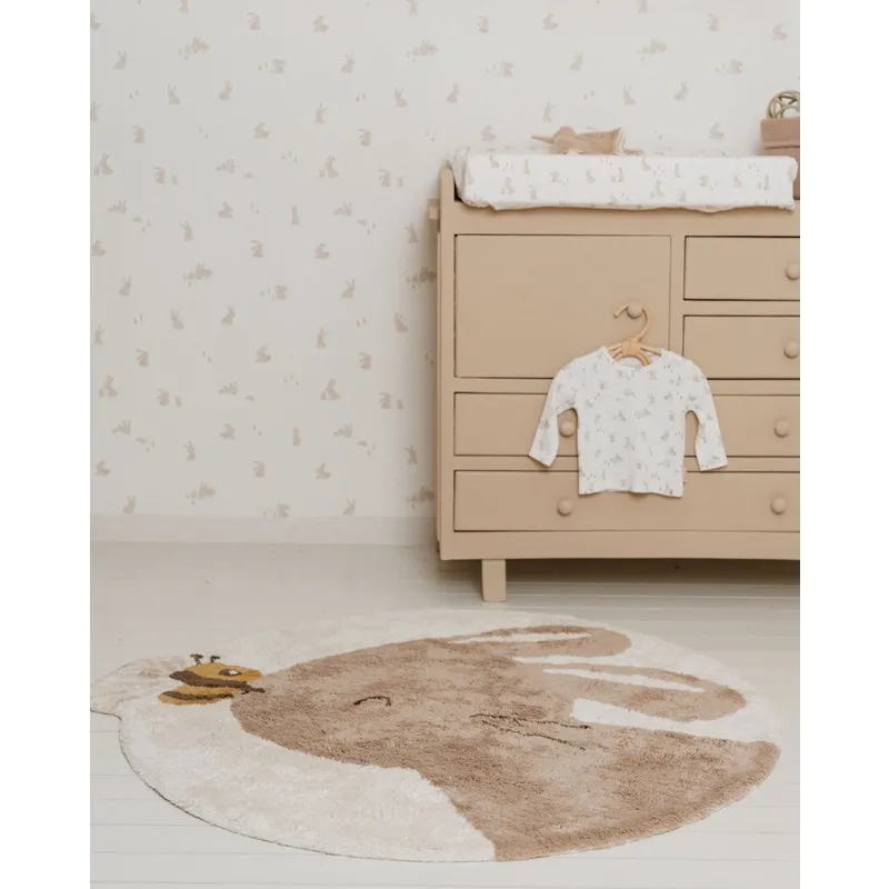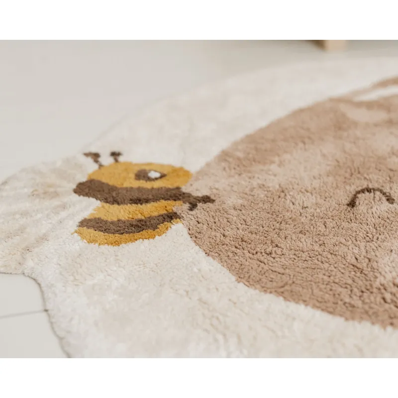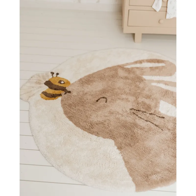 Добавете малко уют и топлина към вашата детска стая с този килим с формата на сладко зайче е в неутрален бежов нюанс с пчела на носа. Изработен от 100% органичен памук и с неплъзгаща се латексова подложка, килимът може да се почиства в пералня.