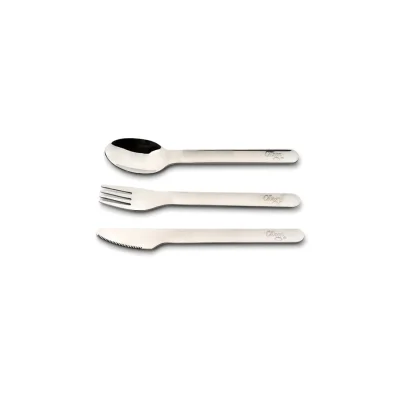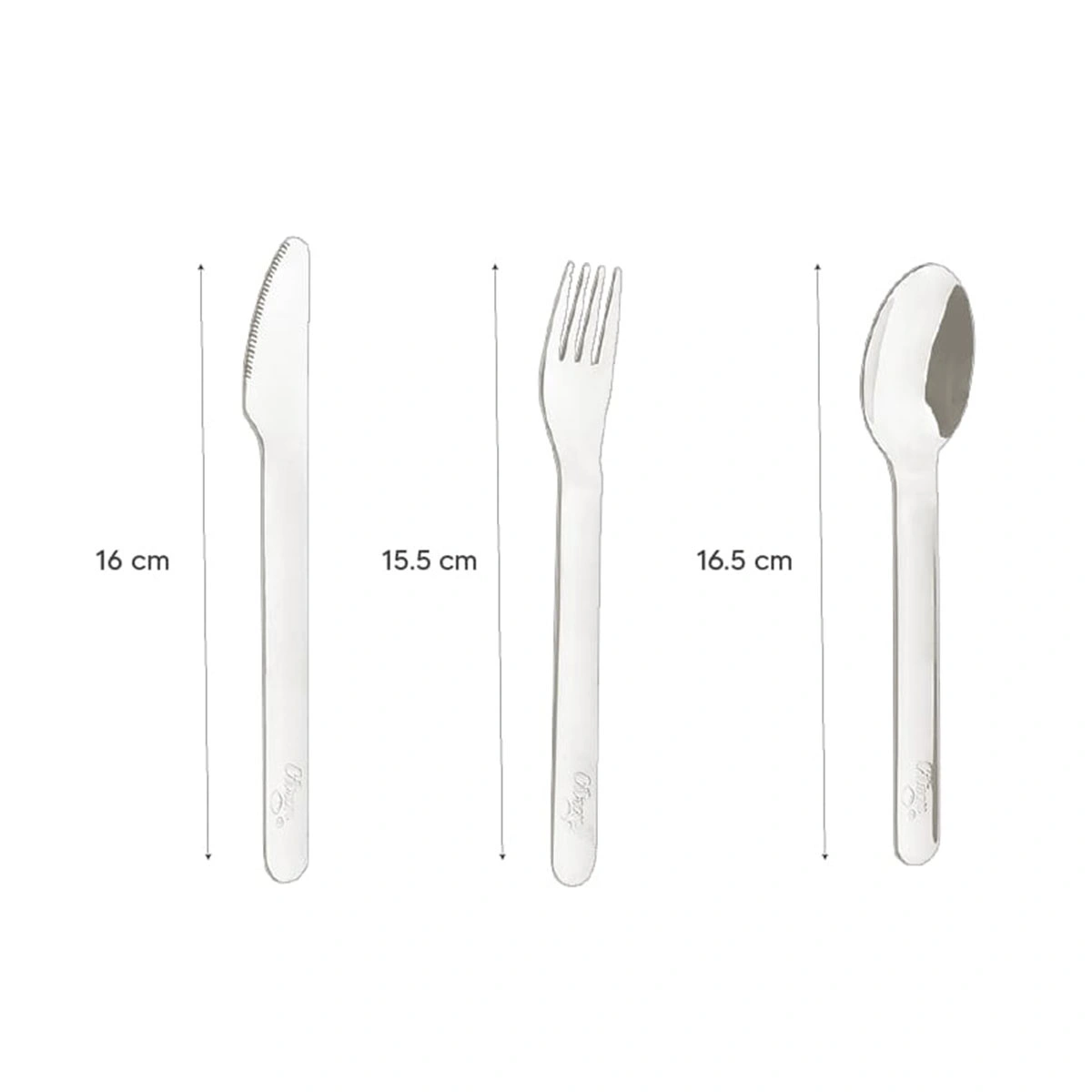 Комплектът включва 3 броя пробора за хранене от неръждаема стомана – вилица, лъжица и нож, както и силиконов калъф за съхранение.