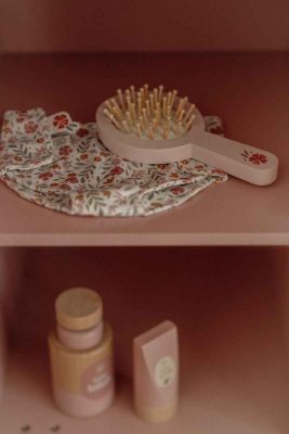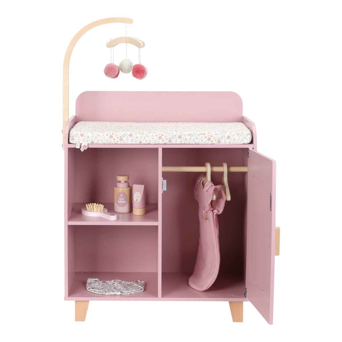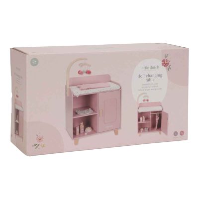 Освен това, масата е снабдена с пелена, спален чувал и весели закачалки за дрешки, за да бъдат тоалетите на куклата винаги подредени. Шкафчето с рафтчета осигурява допълнително място за съхранение на всички принадлежности, така че вашата кукла винаги да бъде добре обгрижена.