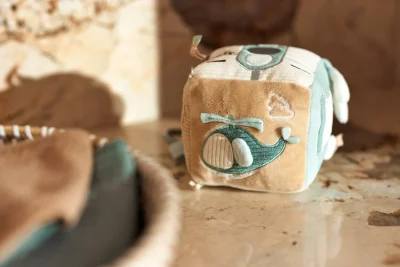 Този приключенски куб за игра с тема „В движение“ е идеален за любознателните малчугани! В прекрасните цветове морско зелено и бисквитено, този куб предлага свят от открития. Ще намерите очарователен ключ с хрускащ звук, щампа на бензиностанция и светофар с огледало, на които вашето мъниче да се възхищава. Освен това има още много забавни елементи, с които да си играе! Този куб за игра стимулира сетивата и осигурява безкрайно забавление!