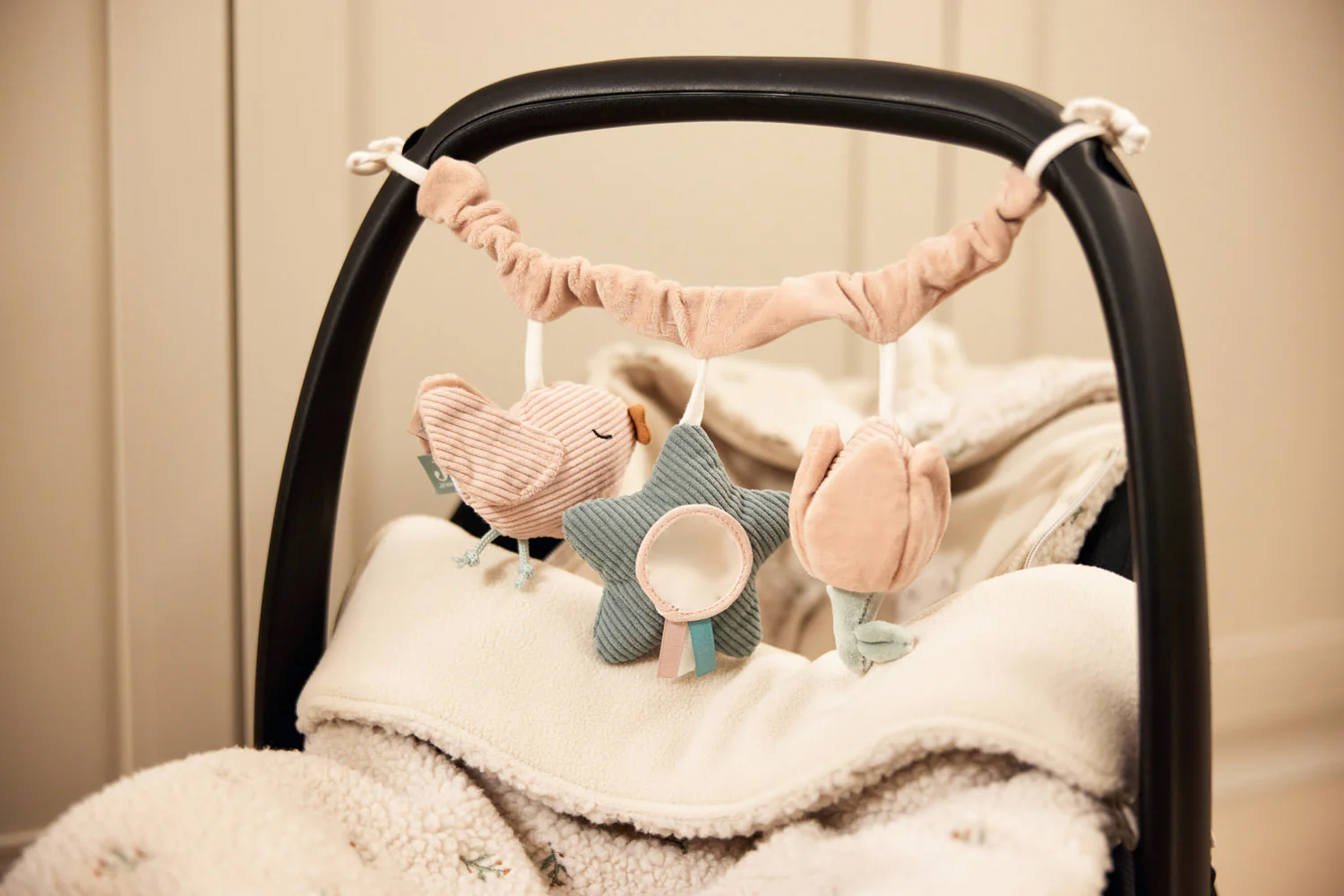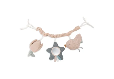 Тази сладка играчка за количка е истинска атракция за нея и гарантира часове забавление! Трите висулки – лале, птичка и къщичка за птици с огледало – правят играта допълнително забавна за вашето мъниче в движение. Пращящите звуци и веселите камбанки са много занимателни.