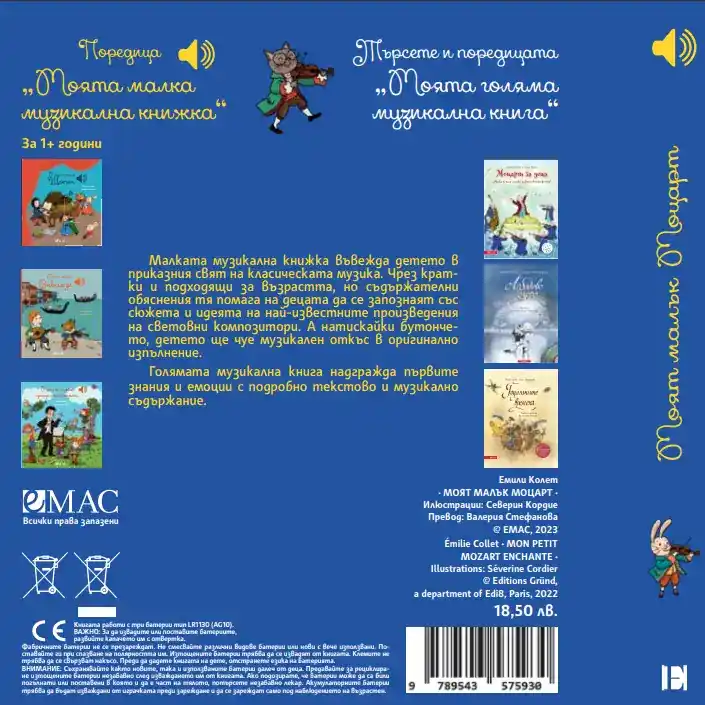 Книжката запознава детето с някои от най-известните музикали произведения. Кратките съдържателни описания обясняват на детето сюжета на произведението. А със сензорните бутончета то може само да пуска и спира мелодиите.