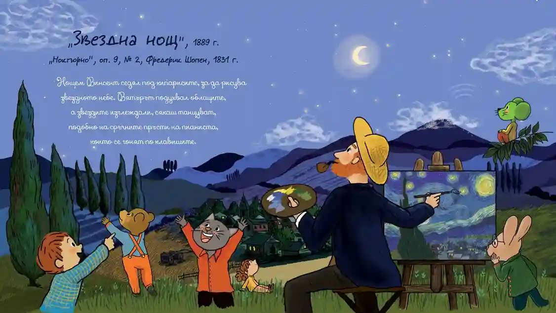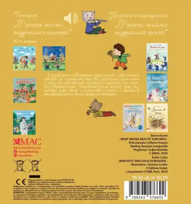 В книжката „Моят малък Ван Гог в музика“ са включени едни от най-известните творби на художника Ван Гог, разкошно допълнени с едни от най-ярките музикални примери от негови съвременници. А със сензорните бутончета детето може само да пуска и спира мелодиите.