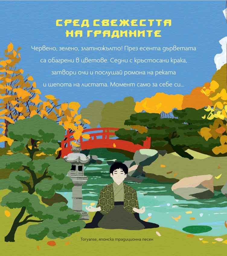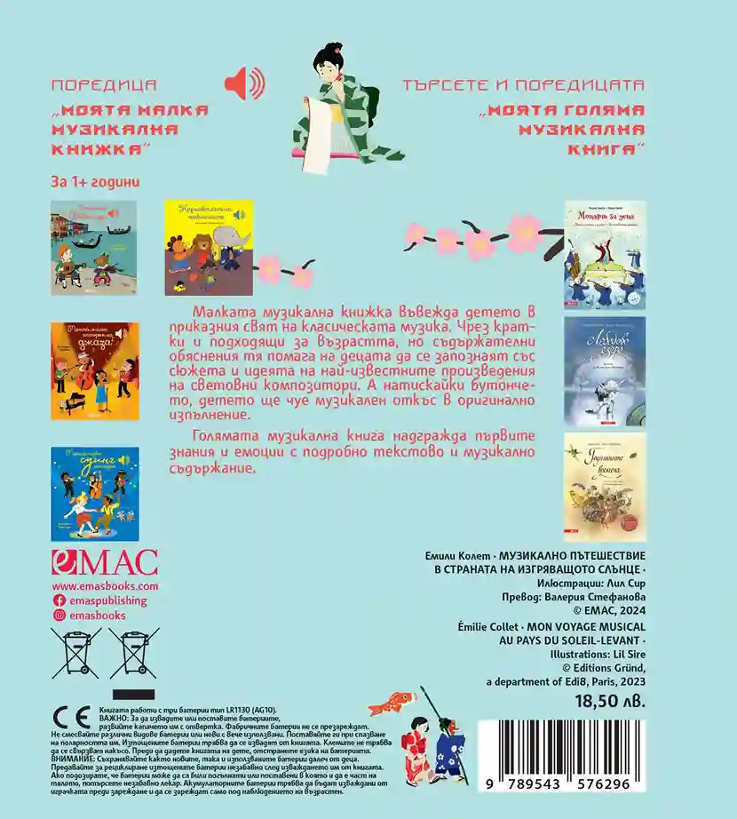 Музикално пътешествие в Страната на изгряващото слънце запознава детето с някои от най – известните произведения от Япония. Кратките съдържателни описания обясняват на детето сюжета на произведението. А със сензорните бутончета то може само да пуска и спира мелодиите.