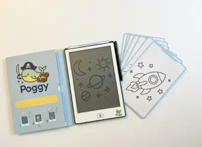 Персонализиран комплект за рисуване – изтриваща се книжка и LCD таблет за писане с 20 шаблона (40 картини), детска дъска за рисуване, 1 писалка PoggyPen.