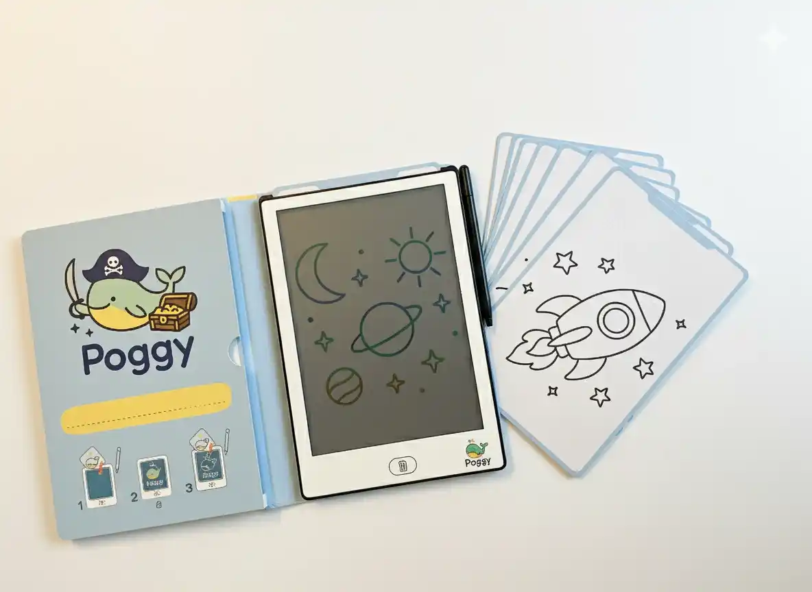 PoggyPad Adventure – малкoтo китче Poggy тръгва на приключение. Готов да изследва света с молив в перка, Poggy открива нови места, животни и приятели във всеки щрих. Всяка карта от комплекта разказва история – гори, океани, планини и тайни острови чакат да бъдат оживени от детското въображение.